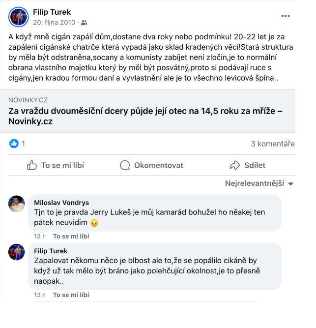 Právě na asociaci romských podnikatelů se Turek v případě rasistických a nenávistných příspěvků odvolává. „Víte dobře, že jsem byl ambasador jedné z asociací romských podnikatelů. V žádném případě mi nikdo nemůže přišít rasismus,“ reagoval.