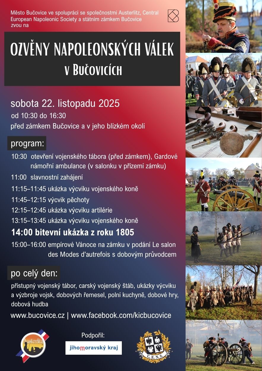 Jak se slavily Vánoce na zámku v době napoleonských válek? Jakými nástroji tehdy operovali raněné? A jak důstojníci plánovali útok ve slavné bitvě u Slavkova? Přijeďte v sobotu 22. listopadu 2025 na Ozvěny napoleonských válek do jihomoravských Bučovic, kde se přenesete do doby krátce před legendární bitvou tří císařů!