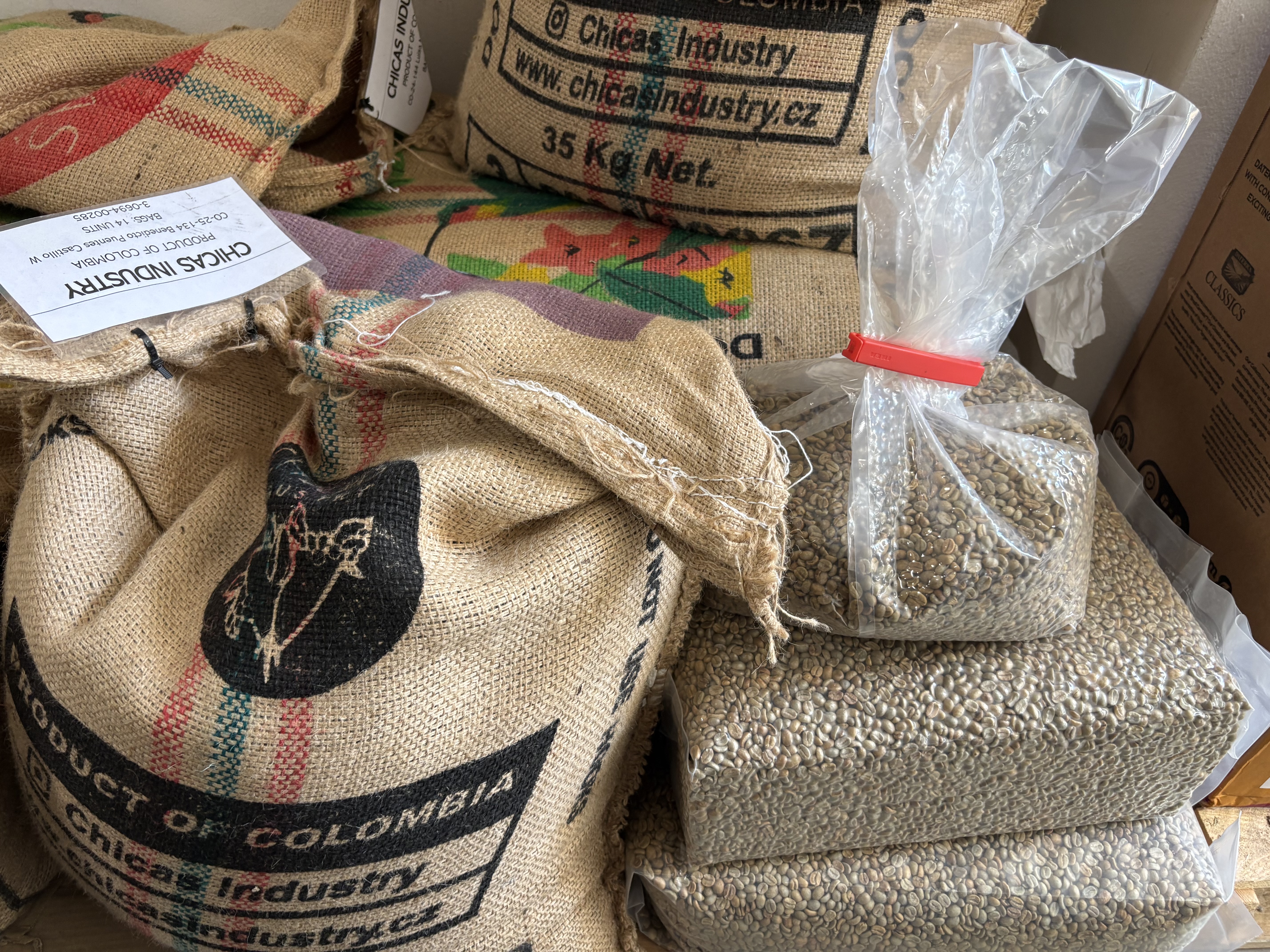 Káva určená k pražení.Aby mohl Dutkiewič pražit, potřebuje zelená zrna. Ta většinou zajišťují importéři, kteří surovinu kupují od farmářů a následně dále přeprodávají. Jejich role je přitom poměrně zásadní, totiž pražírny před podvody. „Některým kolegům se stalo, že vyzkoušeli úžasný vzorky a objednali plnou paletu. Pak přišla úplně jiná zrna v horší kvalitě. Reklamace v takovém případě úplně nefunguje,” říká s tím, že cena za paletu se pohybuje i v nižších stovkách tisíc.