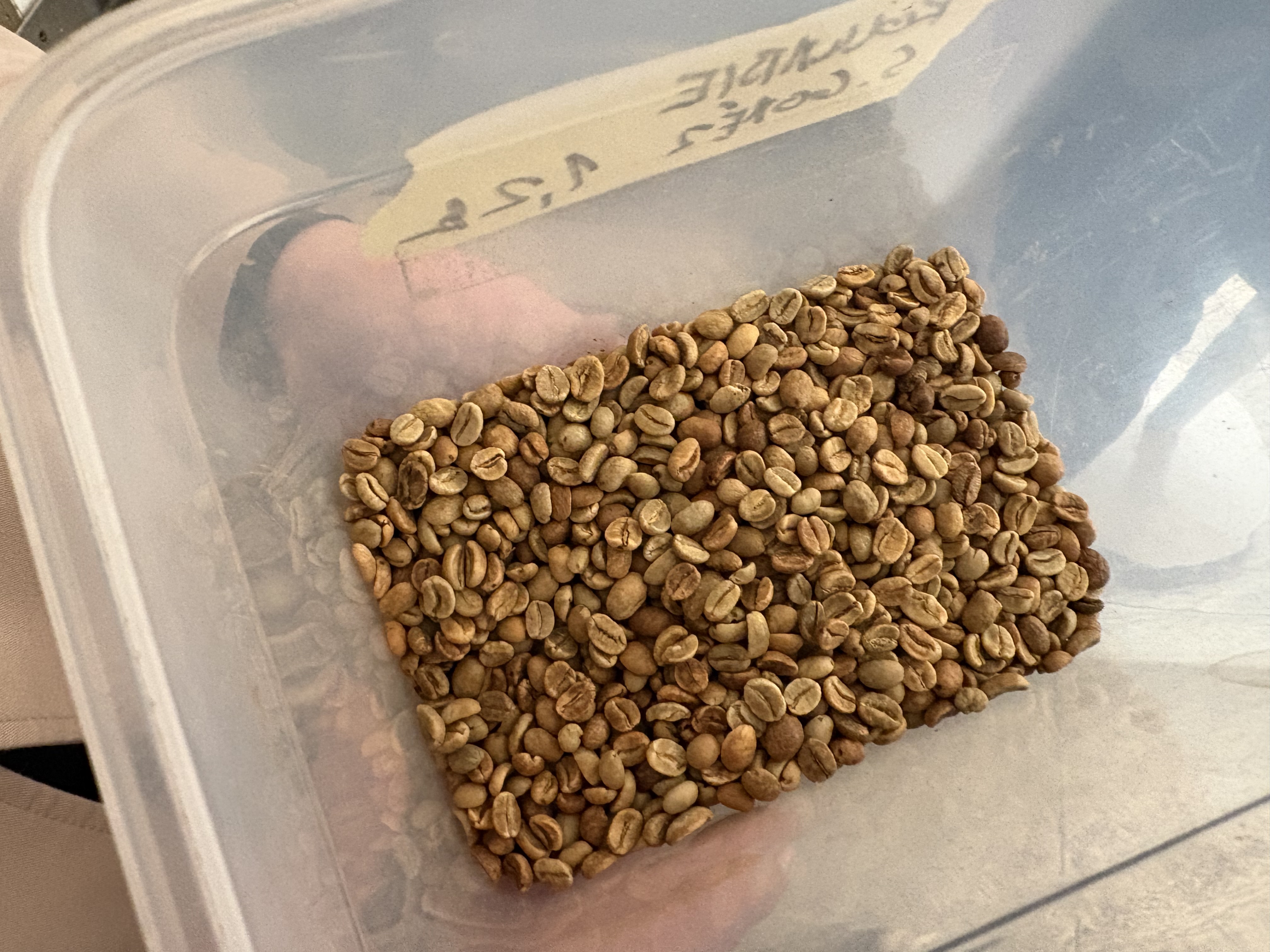 Zelená káva před pražením.Doplnil, že to je naturální Kolumbie, která vůbec nepůjde do prodeje. Koupil jí pouze 100 kilo a budou z ní dělat v kavárnách cold brew. „S touto kávou jsem ještě nepracoval, takže si ji teď upražím na čtyři různé způsoby. Pak to ochutnáme a podle toho určím, jak k tomu přistupovat dál. Říká se tomu profilování,“ uvedl kavárník a mezitím nám ukazoval, jak si na počítači propojeném s pražičkou nastavuje různé hodnoty.